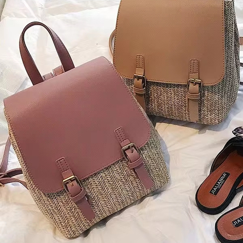 Nieuwe Mode-Ontwerper Rugzak Lederen Stro Weverende Stro Strandtas School Reizen Damestas